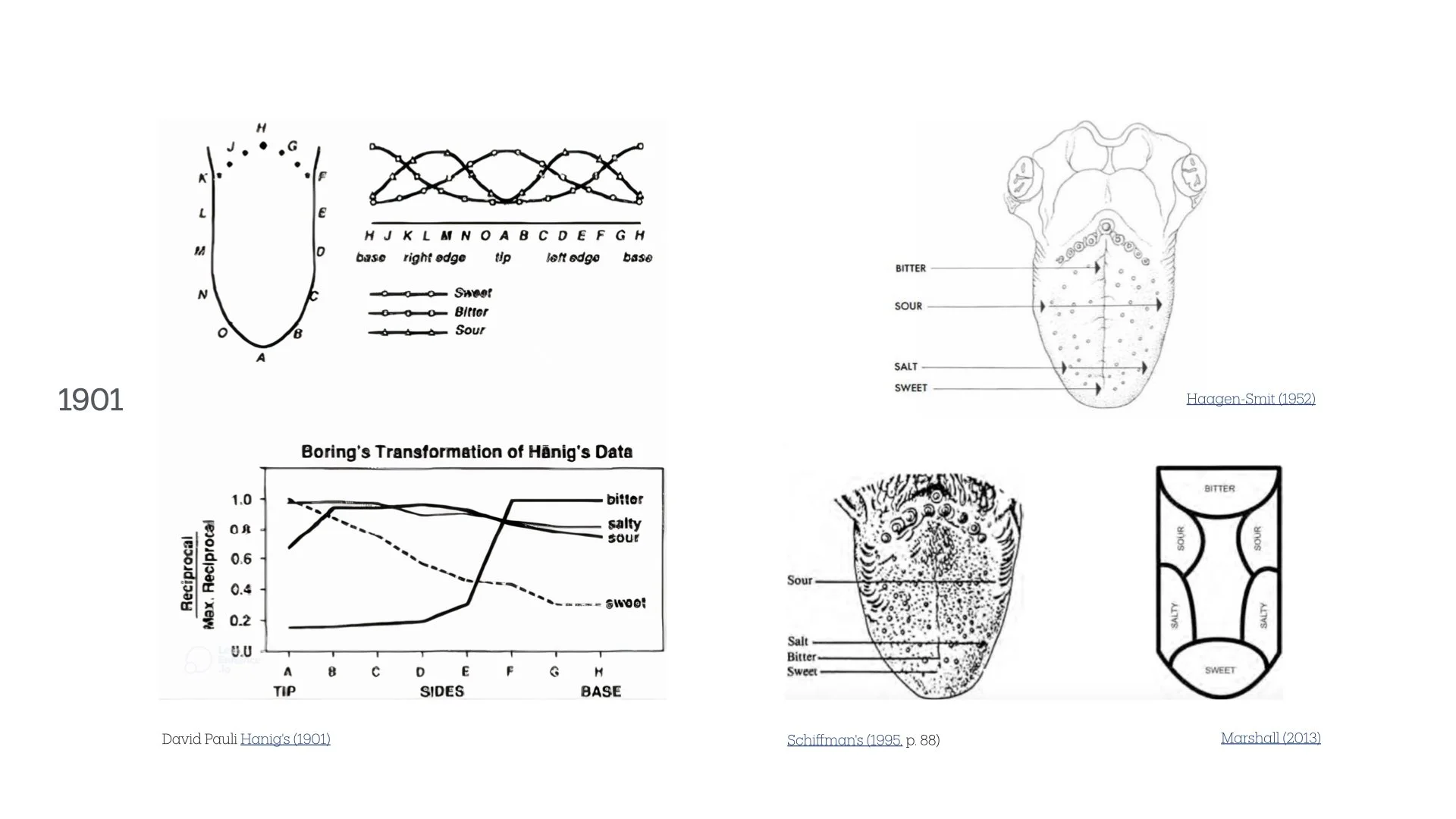 The image traces the evolution of the tongue map myth, from Hänig's 1901 study (misinterpreted as distinct taste zones) to later adaptations by Boring (1942), Haagen-Smit (1952), Schiffman (1995), and Marshall (2013). As discussed in Charles Spence's study, "The tongue map and the spatial modulation of taste perception", modern research confirms taste receptors are distributed across the tongue, yet the false taste map persists in popular belief.